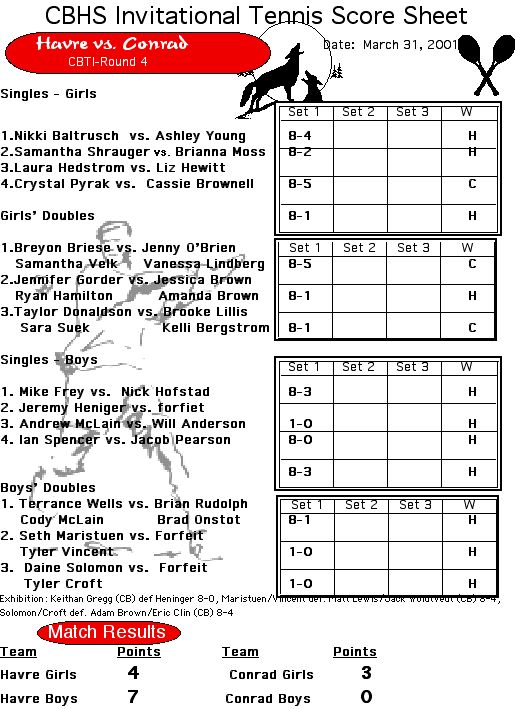 Home | Schedule | Match Results | Roster | Photos | Coaches' Corner | Previous Results | Links |Alumni |Coach Jim Gregg jimg@bresnan.net, 3/4/2004