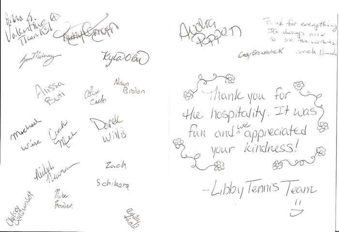 The card below was given to Coach Gregg from the Libby Tennis team expressing their gratitude for the hospitality extended their way during their overnight housing in Cut Bank. We wanted the parents to know once again just how WONDERFUL you guys are!