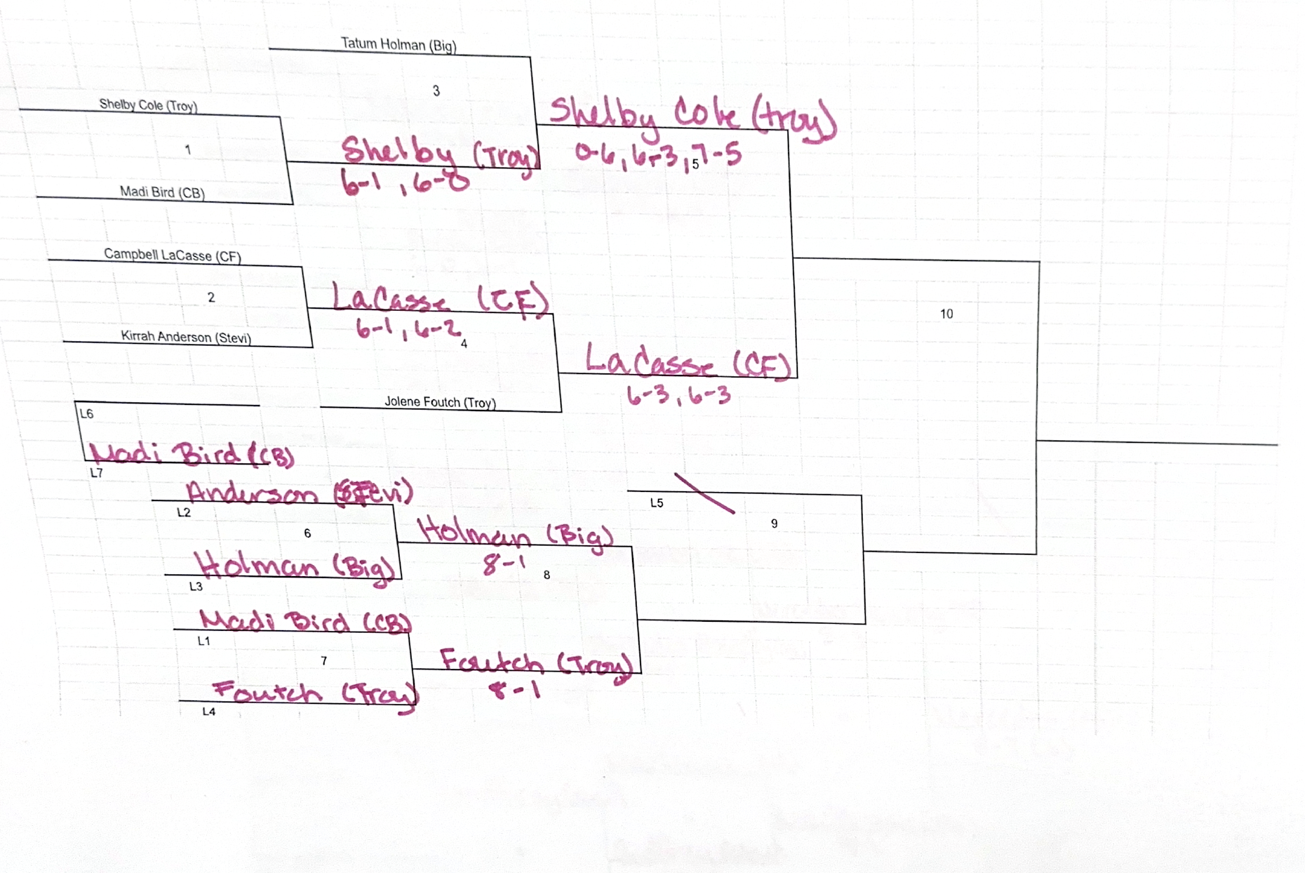 The Libby Invitational Tennis Tournament was set up as a double match guarentee tournament bracketed for each players division. The brackets were for: Girls' Doubles #1, #2,#3, Boys' Doubles #1, #2, #3, Girls' Singles for #1, #2, #3, #4, and Boys' Singles #1, #2,#3 & #4 seeds.Click on the links below to view results. Again, two beautiful days and some great competitive tennis. Thanks Coach Hannah!Each of the links below will show all results for the tournament. Just scroll down until you find the particular bracket you'd like to look at.